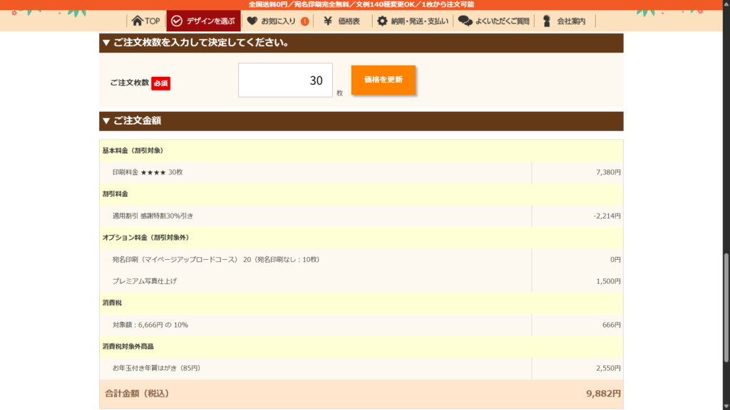 30%の割引をやっていまして、合計金額は30枚頼んで9,882円!